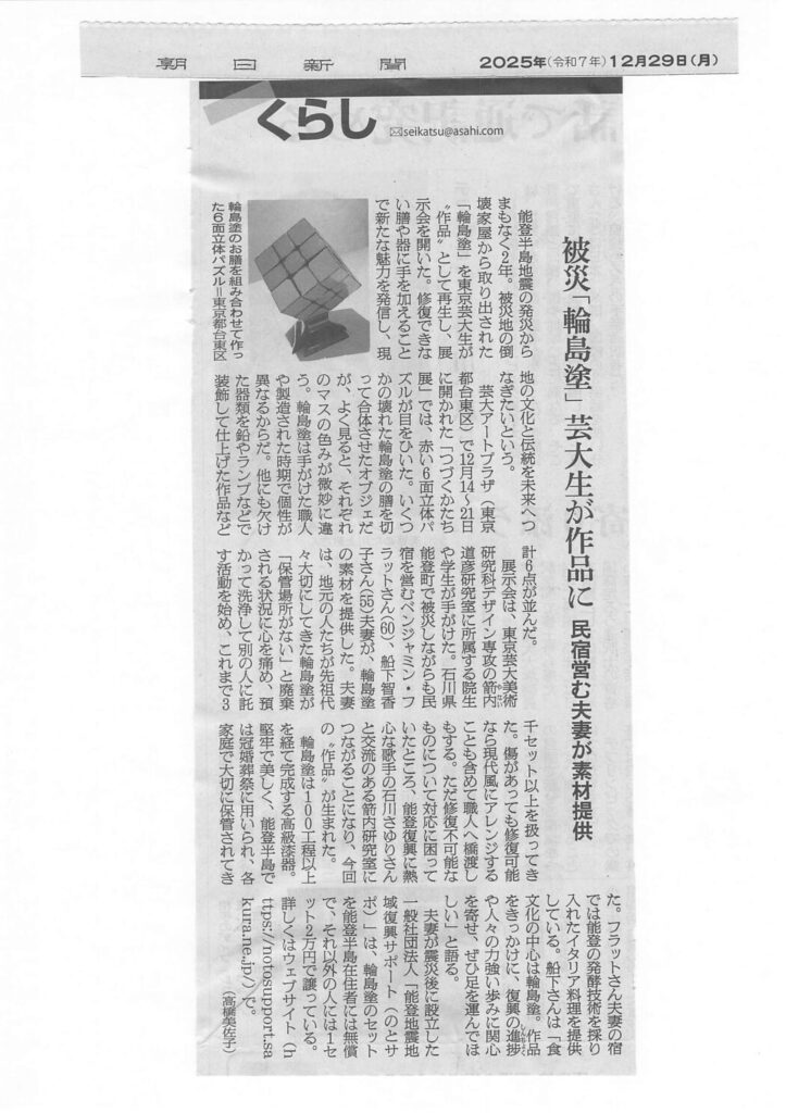 能登サポでは発災以来輪島塗のレスキューを行っています。その中ではどうしても壊れた輪島塗が出てきてしまいます。その行く先に困っていたところ石川さゆりさんのご紹介で、東京藝大の箭内先生をご紹介いただきました。箭内先生のゼミでは、壊れた輪島塗を使って新たなアート作品を作り能登を伝えると言う取り組みをしてくださり、東京藝大の中で「つづくかたち展」という展示会をしていただきました。学生さんたちの作品はどれもユニークで壊れた輪島塗が生き生きとした姿で生まれ変わった姿で展示されていました。単に壊れたものを使うというだけでなく、学生さんが、能登に来てくださり、おばちゃんたちの話を聞いてくださったり、自分達で輪島塗の洗浄などを体験してくださったことで、より深く能登のことを伝えてくださいました。みなさんのご協力で、壊れた輪島塗も未来に繋げられました。ありがとうございます。朝日新聞さんが記事にしてくださったことで、たくさんの方に能登、サポの活動を知っていただき、協力したいと言うご連絡をいただきました。